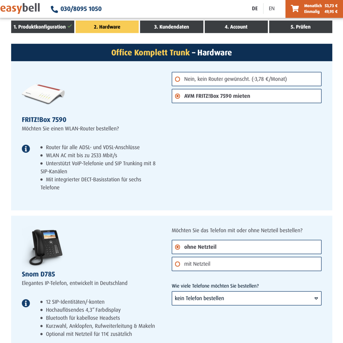 Der Warenkorb am oberen Bildschirmrand zeigt Ihnen jederzeit die monatlichen und die einmaligen Gebühren, damit Sie die volle Kontrolle behalten. Durch einen Klick auf den Warenkorb erhalten Sie eine detaillierte Auflistung aller Produktbestandteile und deren Kosten.