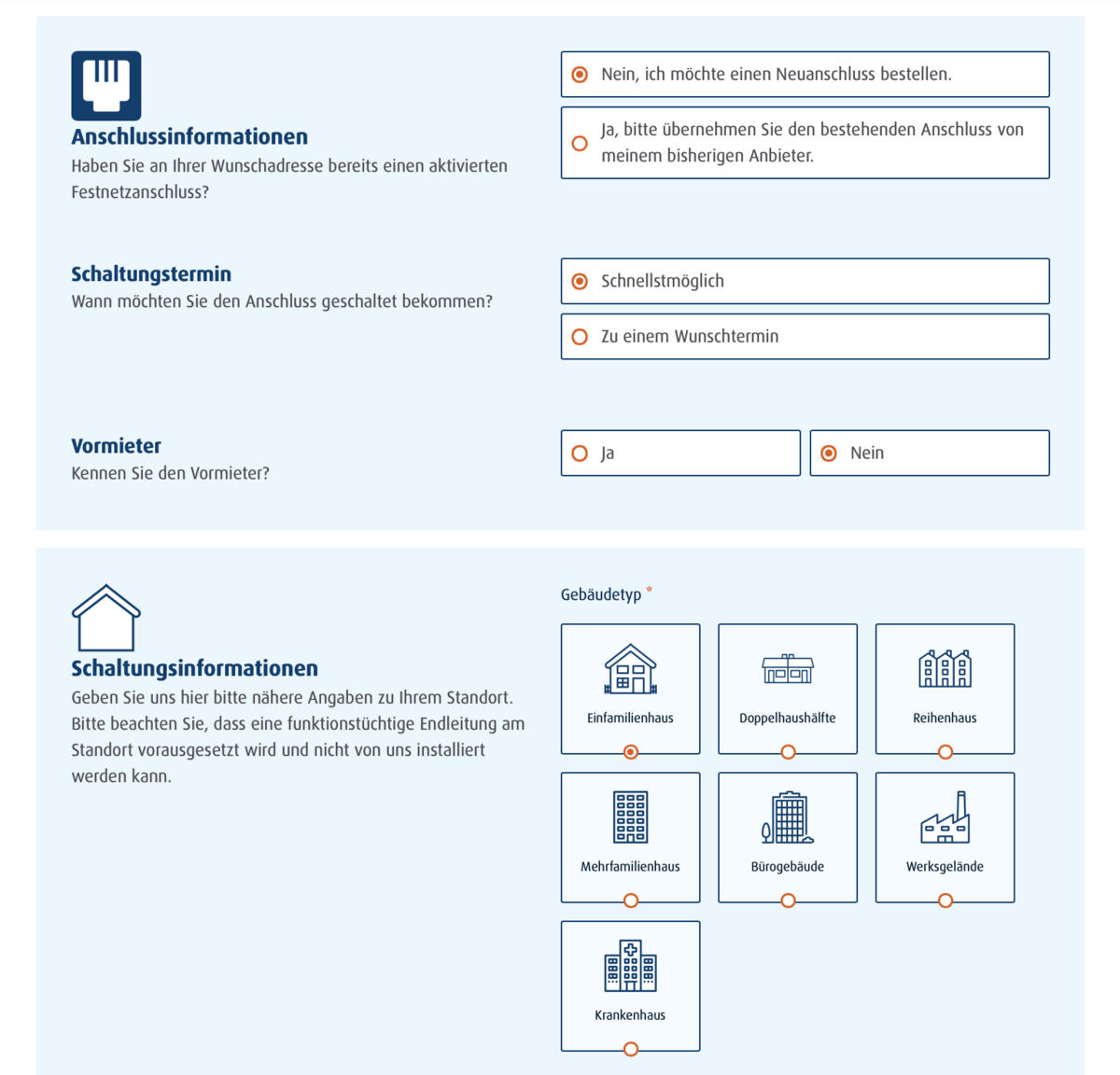 Wenn Sie einen neuen Internetanschluss bestellen wollen, wählen Sie bitte bei den Anschlussinformationen folgendes aus: „Nein, ich möchte einen Neuanschluss bestellen“. Alternativ könnten Sie hier auch einen bestehenden Internetanschluss von einem anderen Anbieter übernehmen. Lesen Sie in diesem Fall bitte unsere Anleitung zur Übernahme eines bestehenden Internetanschlusses.