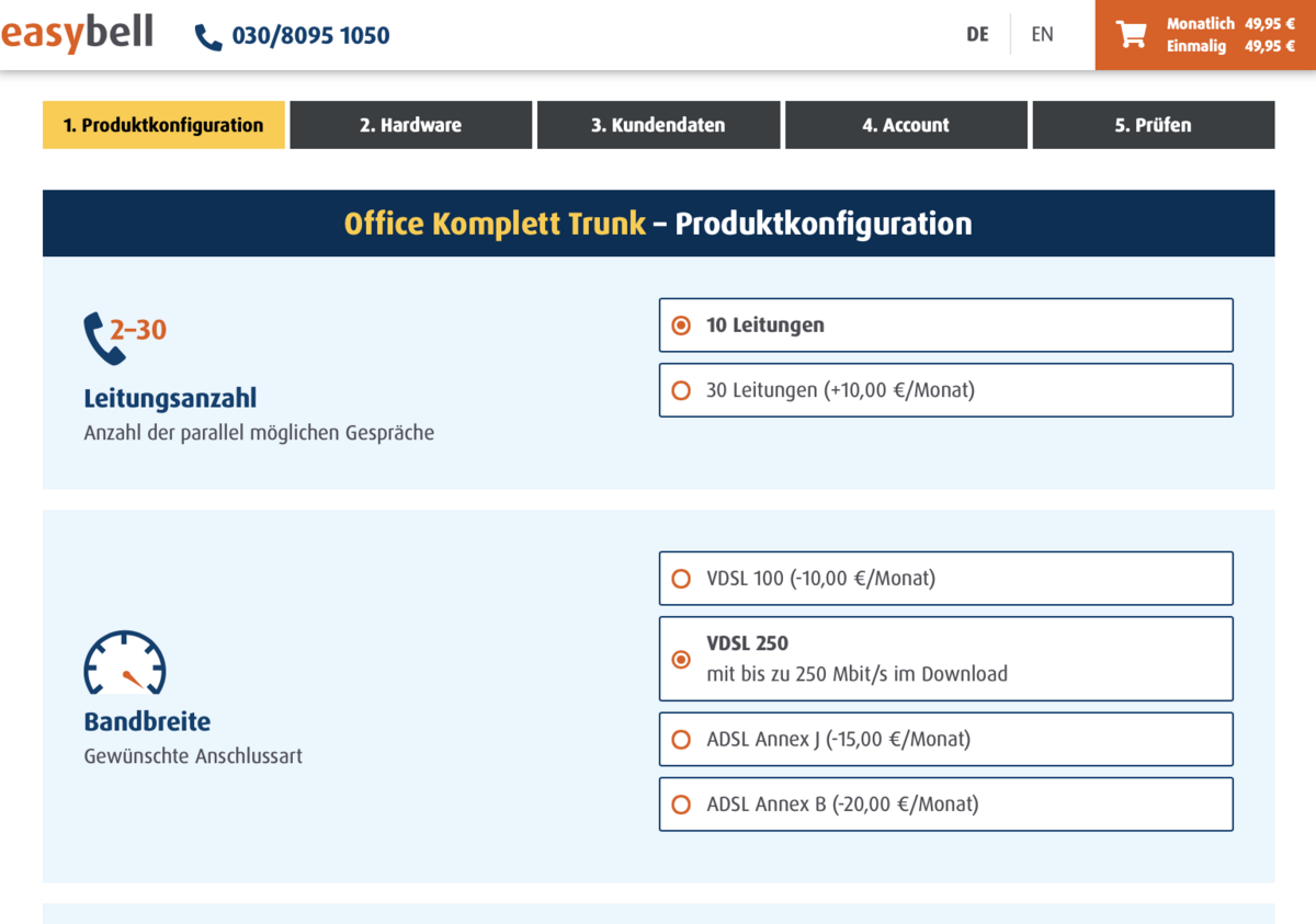 Der Bestellprozess von easybell führt Sie in fünf einfachen Schritten zu Ihrem individuellen Wunschtarif.
