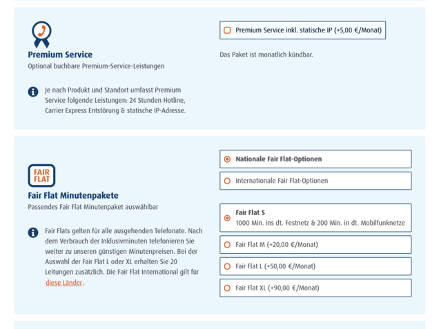 Wählen Sie zunächst die gewünschte Internetgeschwindigkeit. Je nach Tarif und Verfügbarkeit unterscheiden sich die weiteren Optionen. Bei Tarifen für den privaten Gebrauch stehen bspw. Flatrate-Destinationen zur Auswahl, Unternehmen können neben der Anzahl an Sprachkanälen unter anderem unsere Fair Flat Minutenpakete oder die Cloud Telefonanlage wählen.