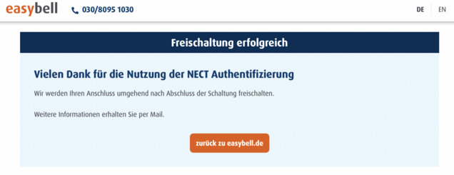 Wenn die Überprüfung durch Nect erfolgreich war, wird Ihnen das von easybell noch einmal bestätigt: „Freischaltung erfolgreich“.