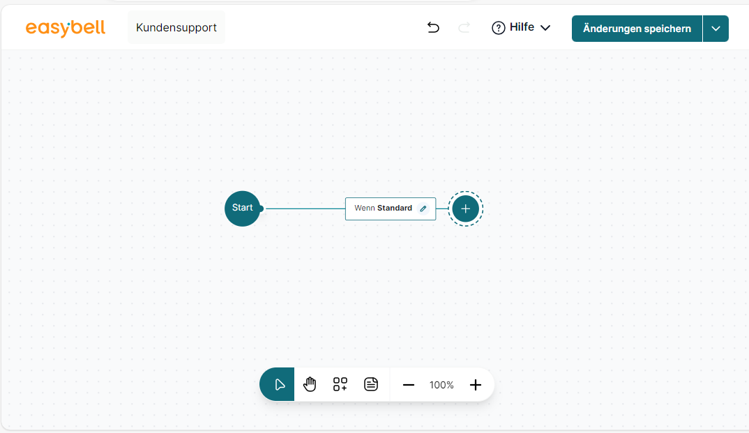 Die Arbeitsfläche enthält am oberen Rand die Kopfleiste sowie im unteren Bereich den Werkzeugkasten. Auf der Arbeitsfläche selbst ist standardmäßig der Startpunkt des Call Flows sowie der erste Konnektor verfügbar.