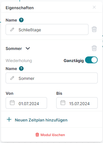 Zur Konfiguration der Daten legen Sie einfach einen oder mehrere Zeitpläne an und legen Sie Start- und Enddatum fest. Es kann zwischen „ganztägig“ und Zeitfenster gewählt werden.