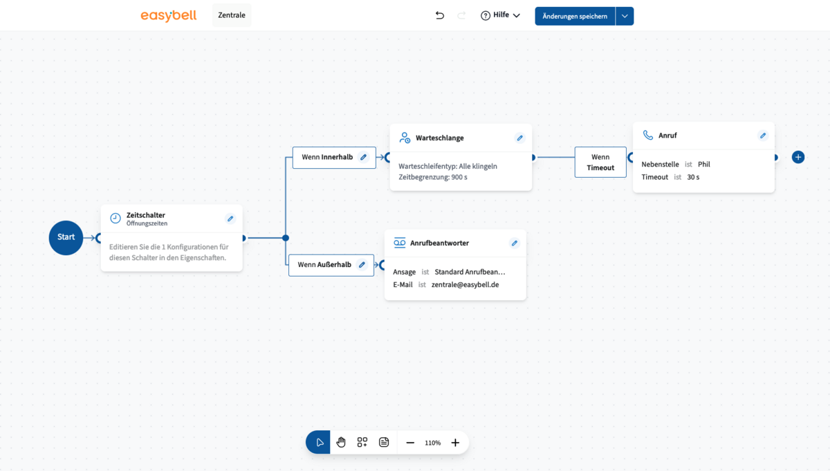 Der Anrufablauf wird mit sogenannten Konnektoren und Modulen auf der Arbeitsfläche geplant. Ein Konnektor bestimmt die Bedingung, unter welcher ein auf ihn folgendes Modul greift. Das Modul bestimmt, was dann passiert (Klingeln, Warteschleife, Anrufbeantworter, Tastenmenü, Befragung etc.).