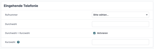 In dem Block “Eingehende Telefonie” wählen Sie die Rufnummer aus, die den Call Flow auslösen wird; ist die Rufnummer ein Rufnummernblock, dann legen Sie noch die Durchwahl fest und vergeben Sie eine interne Kurzwahl, unter dieser wird der Call Flow bei internen Anrufen erreicht.