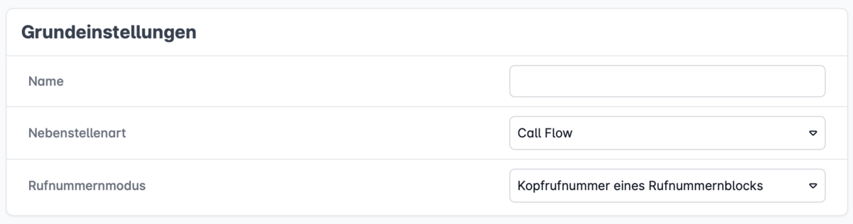 Zum Call Flow Creator gelangen Sie, indem Sie eine neue Nebenstelle in ihrer Cloud Telefonanlage anlegen und in den „Grundeinstellungen“ die Nebenstellenart „Call Flow“ wählen. Es kann der Rufnummernmodus gewählt werden und ein Name muss festgelegt werden. Wir empfehlen einen eindeutigen Namen zu geben, der sinngemäß für diese Nebenstelle ist.