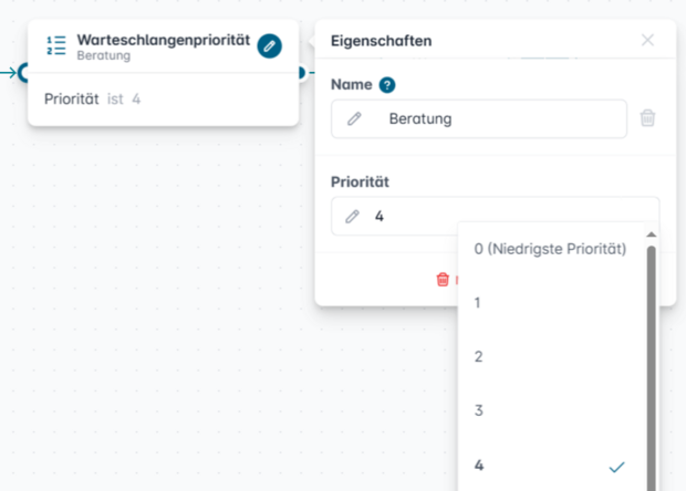 Beim Erreichen dieses Moduls wird dem Anruf eine Priorität zugeschrieben. Diese wirkt sich auf die Zuordnung in einer Wartschleife aus. Anrufe mit hoher Priorität erreichen verfügbare Agenten früher als solche mit niedrigerer Priorität.