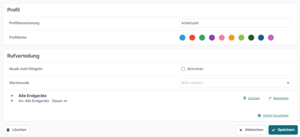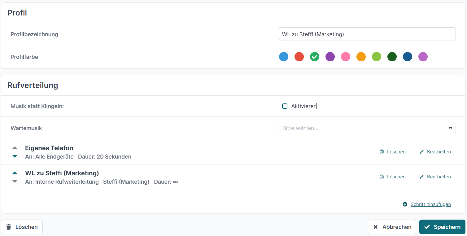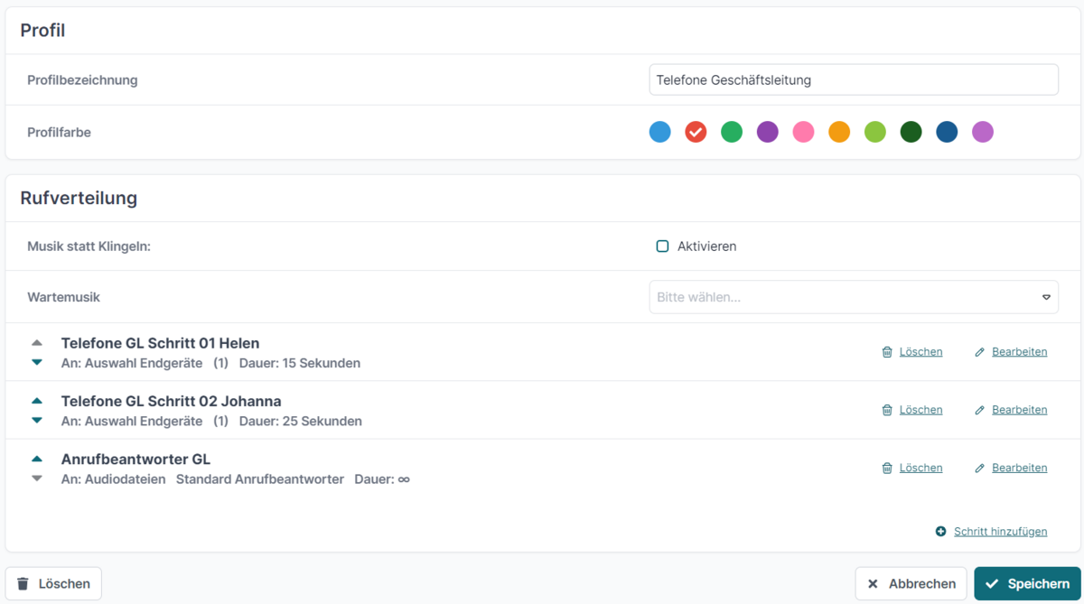 Nachdem der dritte Schritt gespeichert wurde, wird in der Übersicht des Profils die Rufverteilung dargestellt. Die einzelnen Schritte können bearbeitet, gelöscht oder mit Hilfe der Pfeiltasten in eine andere Reihenfolge gebracht werden.