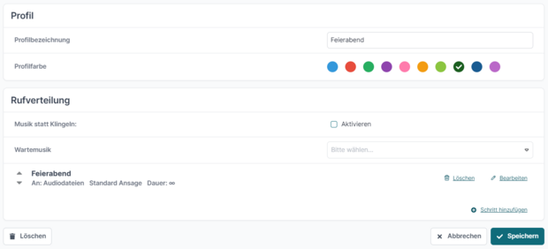 Das dritte Profil ist mit „Feierabend“ benannt und leitet alle Anrufe auf den Anrufbeantworter der Nebenstelle „Zentrale“ weiter. Anrufende haben so die Möglichkeit, eine Nachricht zu hinterlassen.