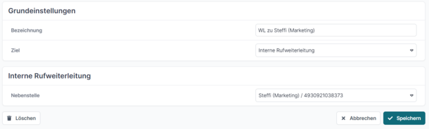 Im gewählten Beispiel leitet die Nebenstelle „Karl (Assistenz)“ den Anruf an die Nebenstelle „Steffi“ weiter.