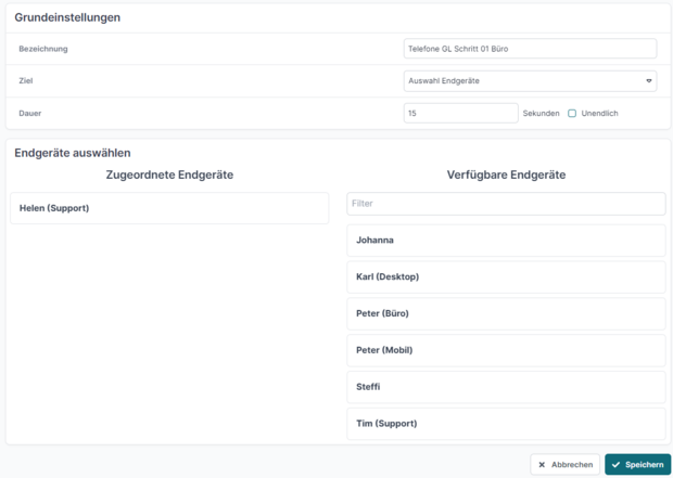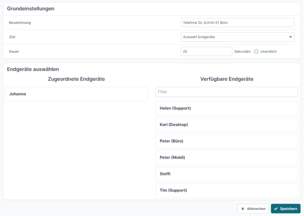 Dazu muss unter „Ziel“ die Option auf „Auswahl Endgeräte“ geändert werden. Anschließend sehen Sie unter „Endgeräte auswählen“ eine Liste aller verfügbaren und aller bereits zugeordneten Geräte. In diesem Beispiel wählen wir „Helen (Support)“ und stellen die Dauer auf 15 Sekunden.
