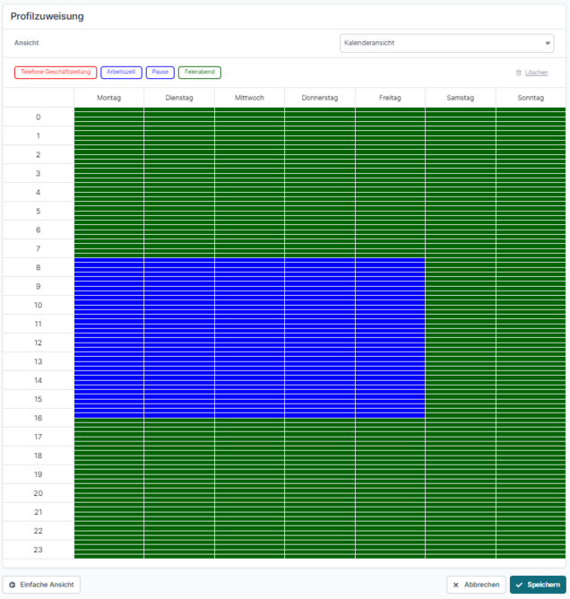 Hinweis: Für Zeiträume ohne Profilzuweisung wird KEINE Weiterleitung durchgeführt. Das bedeutet, dass alle Endgeräte, die der jeweiligen Nebenstelle zugeordnet sind, parallel signalisiert werden.
