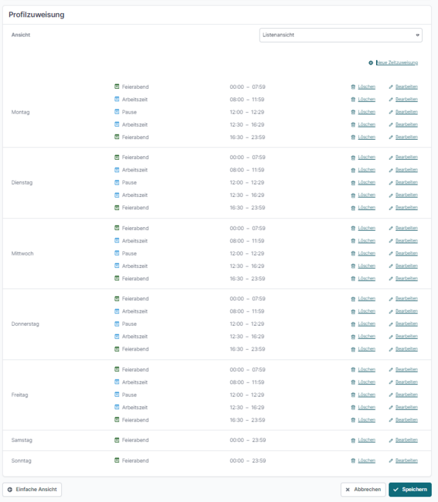 Nachdem alle Profile angelegt sind, muss noch eingestellt werden, wann diese jeweils aktiv sein sollen. Dies geschieht in der Profilzuweisung.