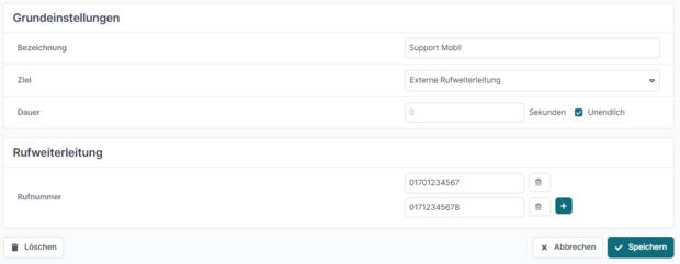 Der vierte Schritt leitet den Anruf auf eine Anzahl von externen Rufnummern weiter, im Beispiel zwei Mobilfunknummern. Mit einem Klick auf das „Plus“-Symbol können hier weitere Rufnummern hinzugefügt werden.