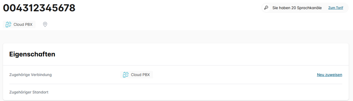 Damit die Rufnummer in der Cloud Telefonanlage (CTA) genutzt werden kann, muss sie dieser zugewiesen werden. Gehen Sie dafür bitte auf das Feld „neu zuweisen" und wählen dort „Cloud PBX".