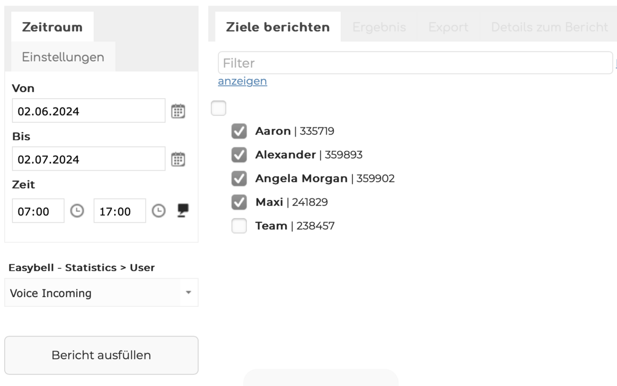 Bei einigen Berichten können Sie zusätzlich unterscheiden, ob sie die ausgehende oder ankommende Telefonie betrachten wollen.