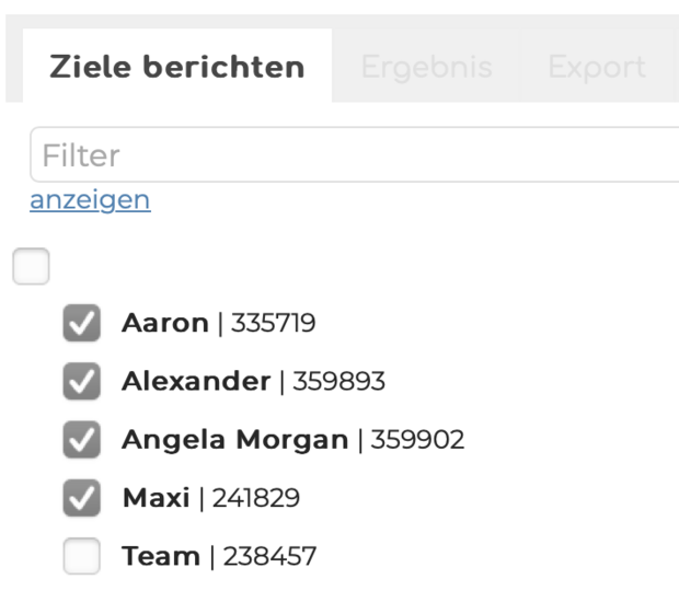 Nachdem Sie entschieden haben, für welche Art der Nebenstellen Sie einen Bericht erstellen wollen, öffnet sich daneben der Reiter „Ziele berichten“.