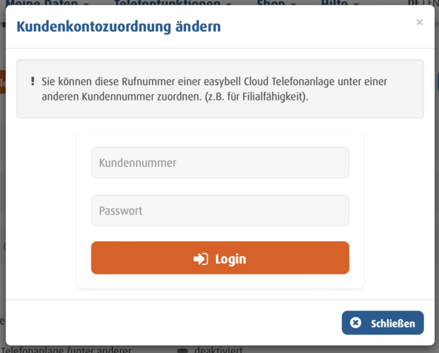 - Loggen Sie sich im easybell Kundenportal mit der Kundennummer ein, deren Rufnummer Sie in der Cloud Telefonanlage einer anderen Kundennummer registrieren wollen.