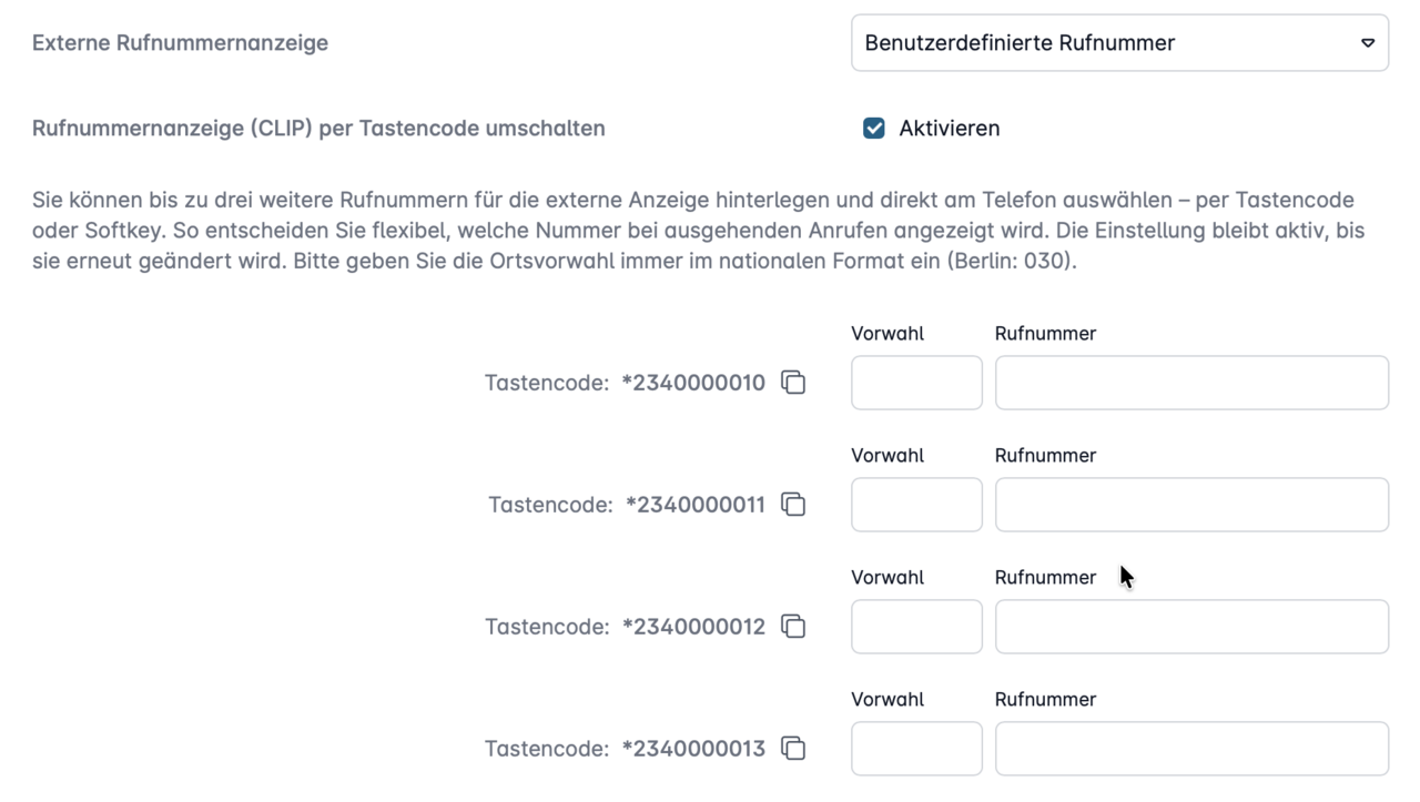 Nach der Aktivierung können Sie bis zu drei weitere externe Rufnummern hinterlegen. Jede dieser Nummern erhält einen eigenen Tastencode, mit dem Sie die gewünschte Nummer direkt am Endgerät auswählen. Sobald Sie den entsprechenden Tastencode wählen, wird diese Rufnummer bei ausgehenden Gesprächen angezeigt – so lange, bis Sie eine andere Nummer aktivieren.