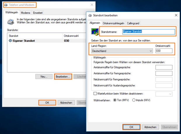 Bei einigen Windows-Systemen kann es notwendig sein, dass der eigene Standort definiert wird. Hierzu öffnen Sie bitte die „Telefon und Modem“-Einstellungen und bearbeiten den „Eigenen Standort“.