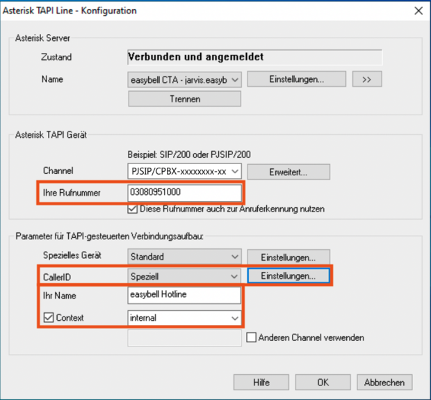 Im Fenster „Asterisk TAPI Line – Konfiguration“ nehmen Sie folgende Einstellungen vor:
