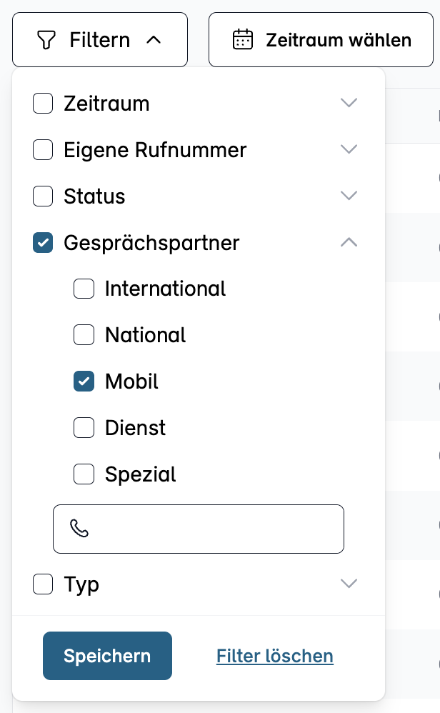 Die Anrufe in der Liste können nach verschiedenen Anrufdetails kombiniert gefiltert werden. Unter dem Punkt „Filtern“ können Anrufe nach folgenden Details analysiert werden: