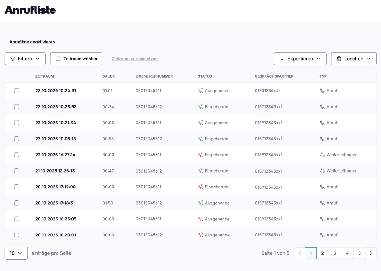 - Status: Eingehende, ausgehende, beantwortete oder unbeantwortete Anrufe