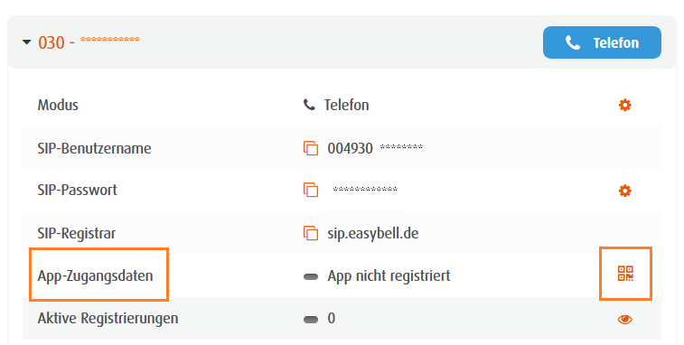 4. Unter der gewünschten Rufnummer finden Sie den Punkt „App-Zugangsdaten“. Klicken Sie auf das QR-Code-Symbol rechts daneben. Wichtig: Die App Zugangsdaten werden nur angezeigt, wenn sich die Rufnummer im Modus "Telefon" befindet.