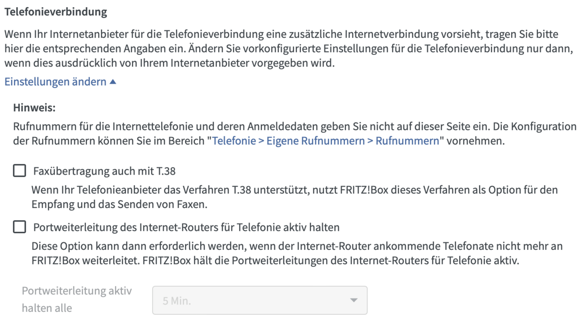 - Wenn Sie ein Faxgerät an der FRITZ!Box betreiben: Das Faxprotokoll T.38 deaktivieren.