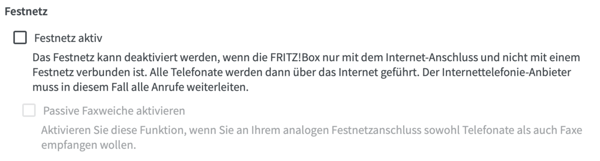 In Deutschland sind inzwischen nahezu alle Telefonanschlüsse IP-basiert. Die klassische Festnetztelefonie ist in der FRITZ!Box daher standardmäßig deaktiviert.