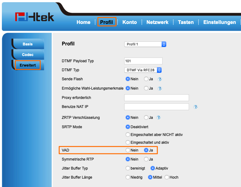 Unter dem Menüpunkt „Erweitert“ aktivieren Sie bitte die „Voice Activity Detection / VAD“.