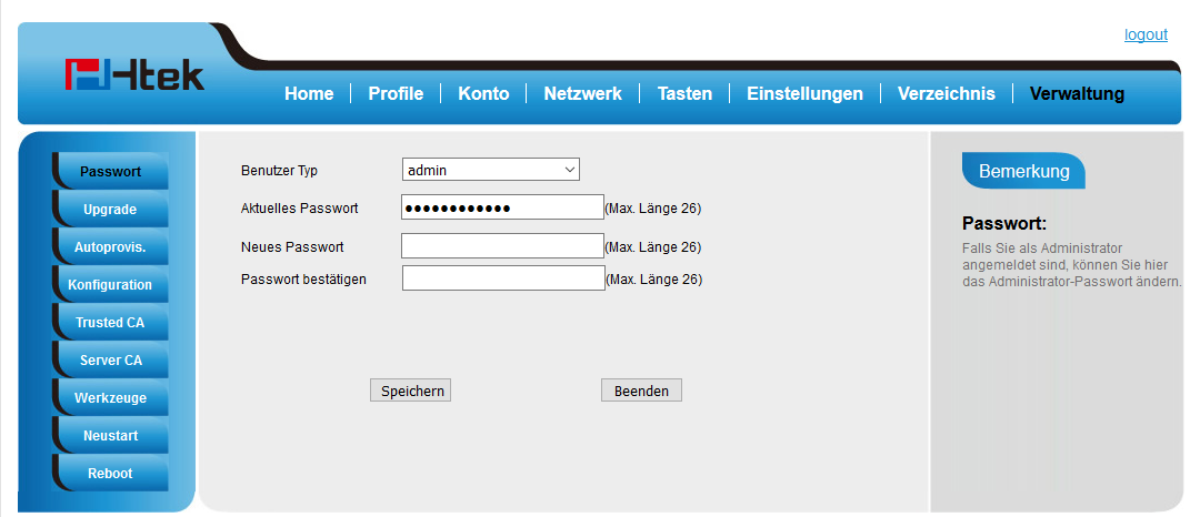 Um das das Administrator-Passwort zu ändern klicken Sie bitte im oberen Menü auf „Verwaltung“ und geben Sie das aktuelle und das neue Passwort ein.