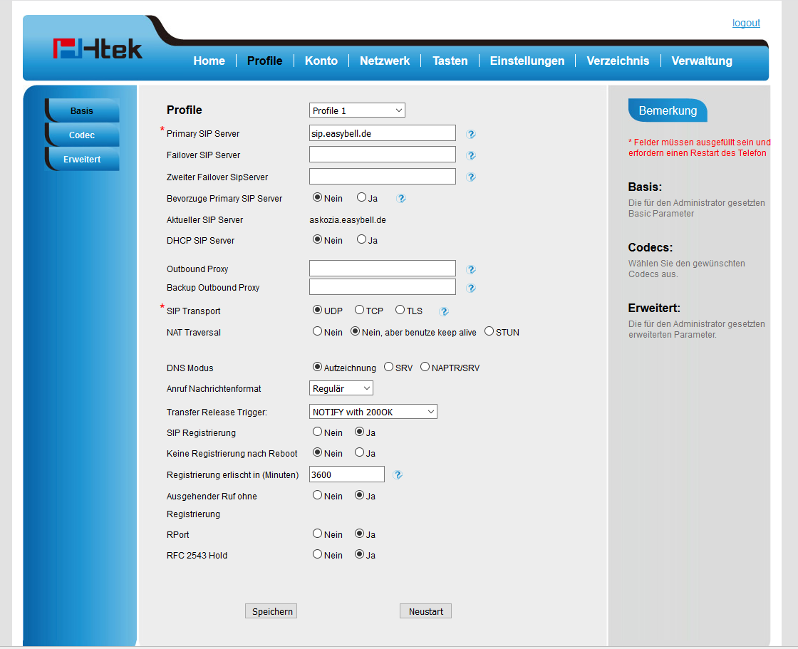 Folgende weitere Parameter müssen für die Verwendung eines Easybell-Accounts gesetzt werden: (Hinweis: Bei der Verwendung einer eigenen TK-Anlage können diese abweichen.)