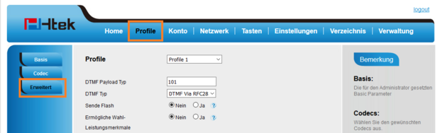 Sofern das HTEK UC924 nicht mit der ACS-Funktion der Cloud Telefonanlage provisioniert wurde, müssen Sie noch eine manuelle Einstellung im Telefon vornehmen, um nach der Anrufübernahme die Rufnummer des Anrufers zu sehen.