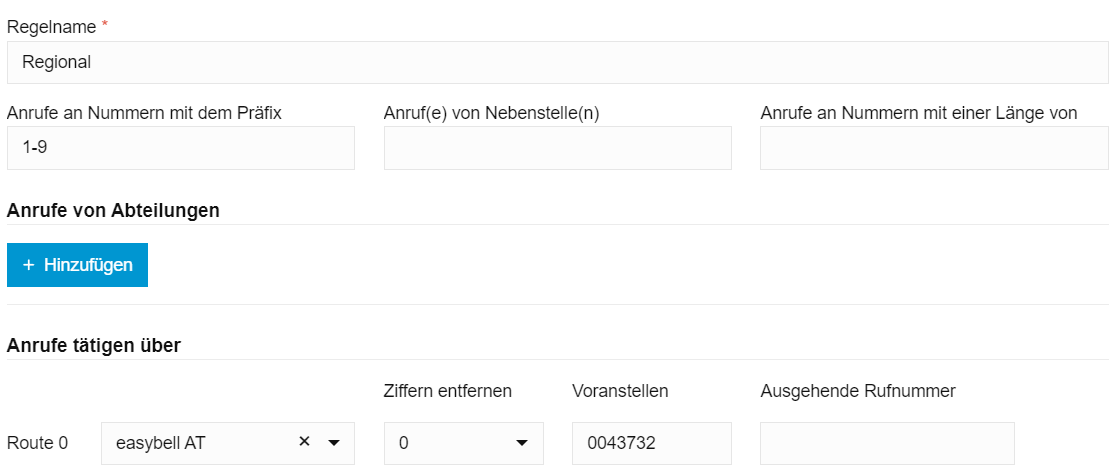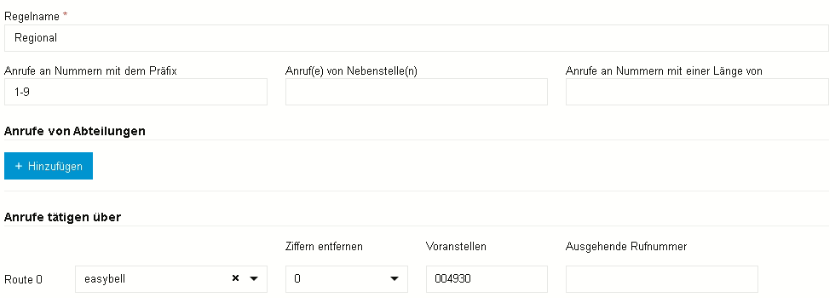 Zuletzt müssen Sie die Regel „Regional“ erstellen, welche für den Fall gilt, dass der Nutzer lediglich die Zielrufnummer ohne Landeskennzahl und Ortsrufnummer wählt (1231231). In diesem Fall wird keine Ziffer abgeschnitten. Es muss die Landeskennzahl sowie die Ortsvorwahl vorangestellt werden.