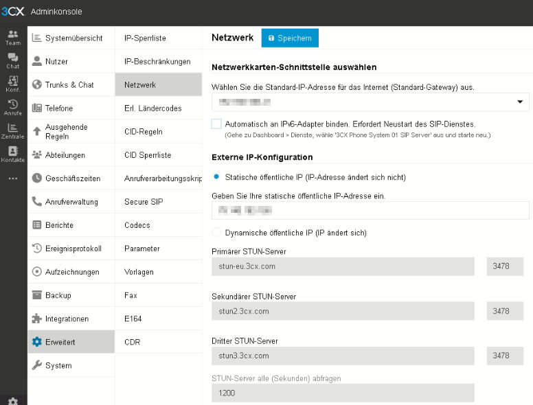 Easybell und 3CX sind je IPv6-konform und nutzen dieses wenn möglich. Sollten Sie jedoch über ein teilkonfiguriertes IPv6-Netzwerk verfügen (ohne öffentliche IPv6-Adresse), muss IPv6 in der 3CX deaktiviert werden. Dazu gehen Sie bitte in der 3CX-Verwaltungskonsole in „Einstellungen“ → „Netzwerk“ und deaktivieren die Option „Automatisch an vorhandene IPv6-Schnittstellen anbinden“.