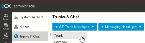 Anschließend navigieren Sie auf der linken Seite zum Abschnitt „Trunks & Chat“ und erstellen über den blauen Button „SIP-Trunk hinzufügen“ ein neues Trunk-Konto.