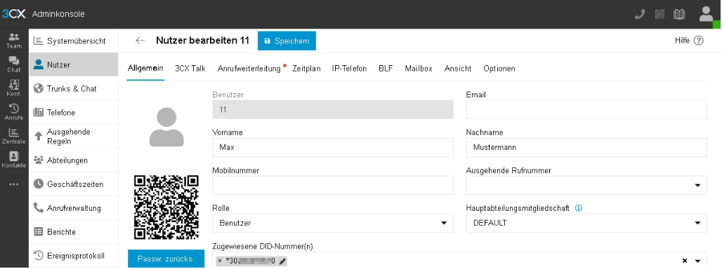 Hier können Sie die Nutzerdaten für die Nebenstelle eingeben. Wählen Sie unter „Zugewiesene DID-Nummer(n)“ die gewünschte Durchwahl für den Nutzer aus.