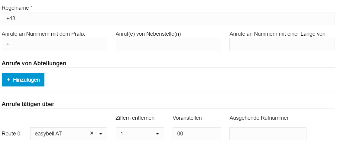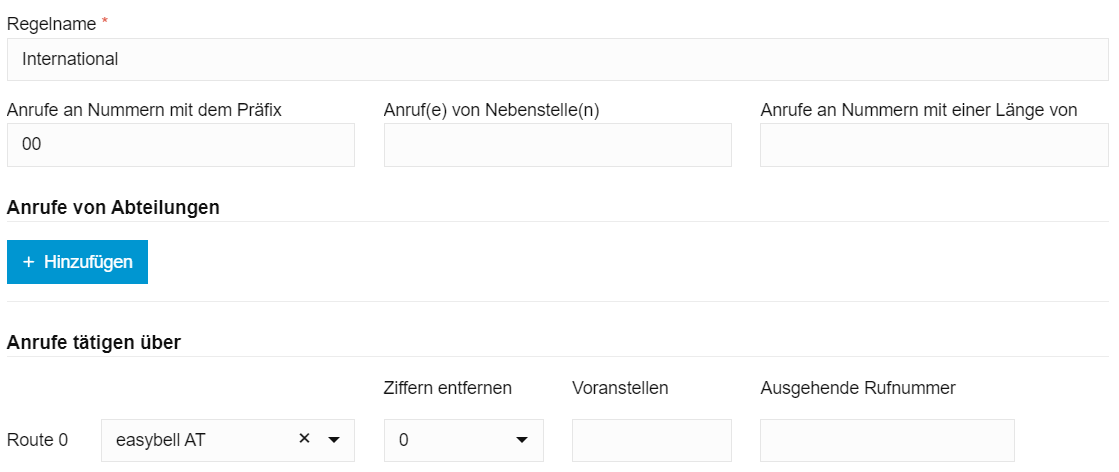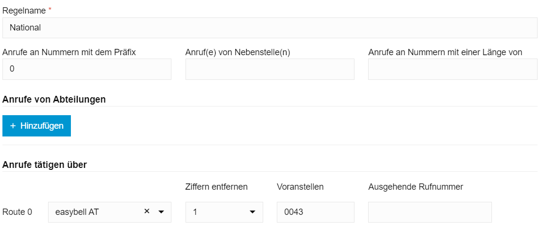 Die „National“-Regel arbeitet die Nummern ab, welche im nationalen Format gewählt wurden (0301231231). Hier muss nun in der gewählten Route zunächst eine Ziffer entfernt werden. Außerdem wird die Landeskennziffer „0043“ vorangestellt.