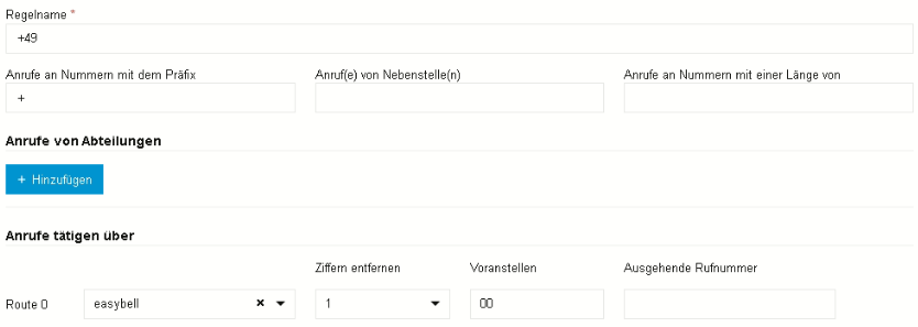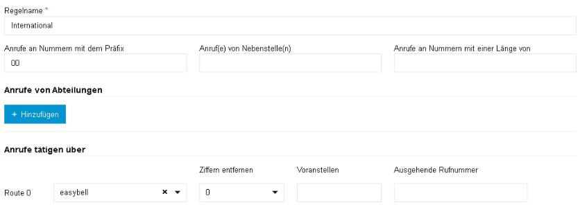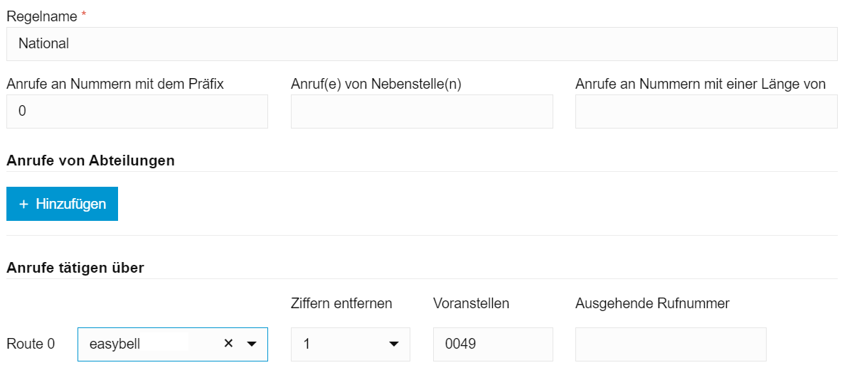 Die „National“-Regel arbeitet die Nummern ab, welche im nationalen Format gewählt wurden (0301231231). Hier muss nun in der gewählten Route zunächst eine Ziffer entfernt werden. Außerdem wird die Landeskennziffer „0049“ vorangestellt.