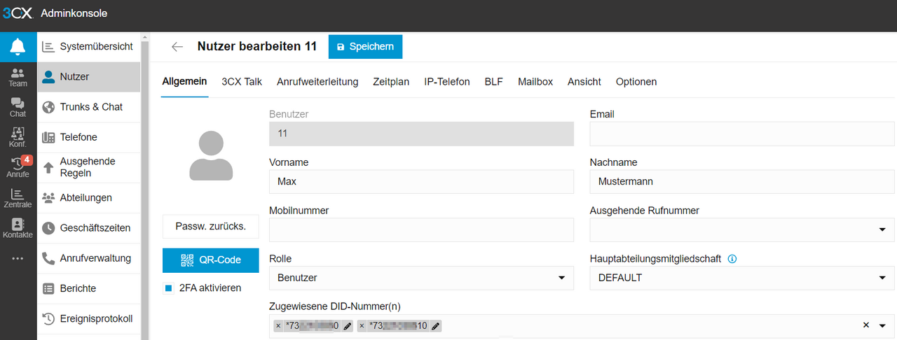 In der 3CX-Weboberfläche gehen Sie bitte in die Einstellungen des jeweiligen Nutzers. Hier kann im Feld „Ausgehende Rufnummer“ die gewünschte Nummer eingetragen werden.