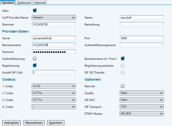 Wählen Sie als VoIP Provider Name "Generic" aus.