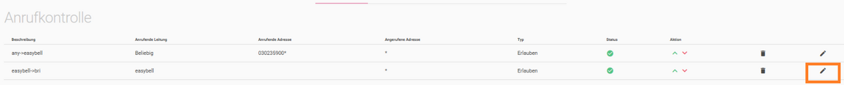 Als nächstes navigieren Sie zu VoIP > Media Gateway > Anrufkontrolle > Routing-Regeln und wählen dort den Eintrag mit der easybell-Leitung zum Bearbeiten aus.