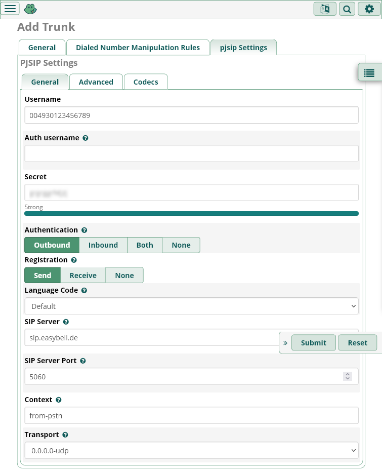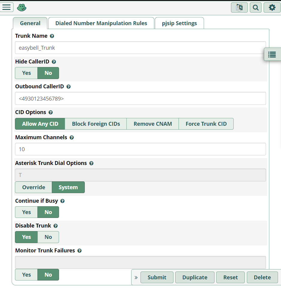 Sobald Sie die grundlegende Einstellung abgeschlossen haben, folgenden Sie bitte den nächsten Schritten, um einen easybell Trunk in der FreePBX einzurichten, um diesen für ein- und ausgehende Telefonate nutzen zu können.