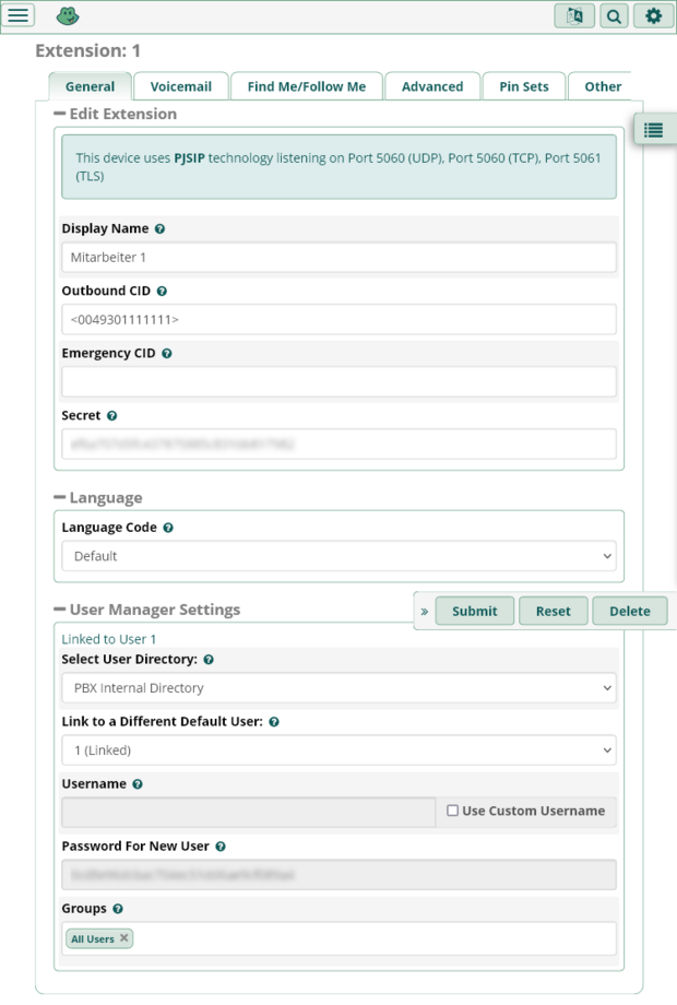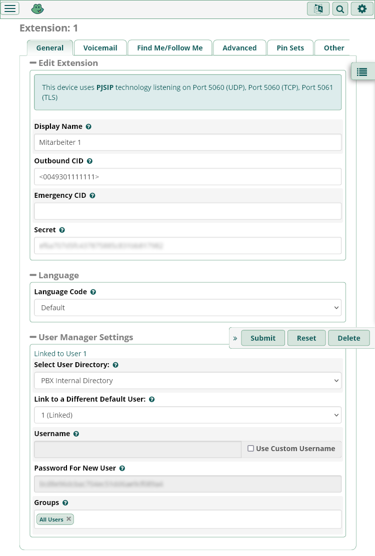 - Secret ist das Passwort, mit welchem die Nebenstelle auf einem IP-Client eingerichtet werden muss, damit sich die Nebenstelle an der PBX anmelden kann.