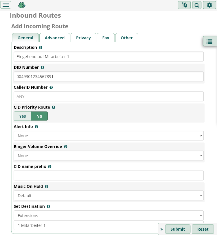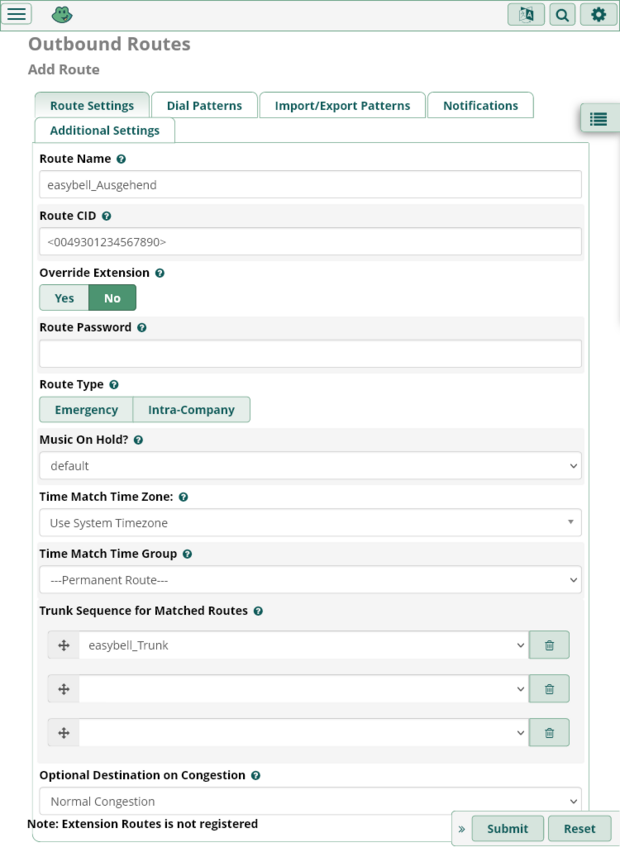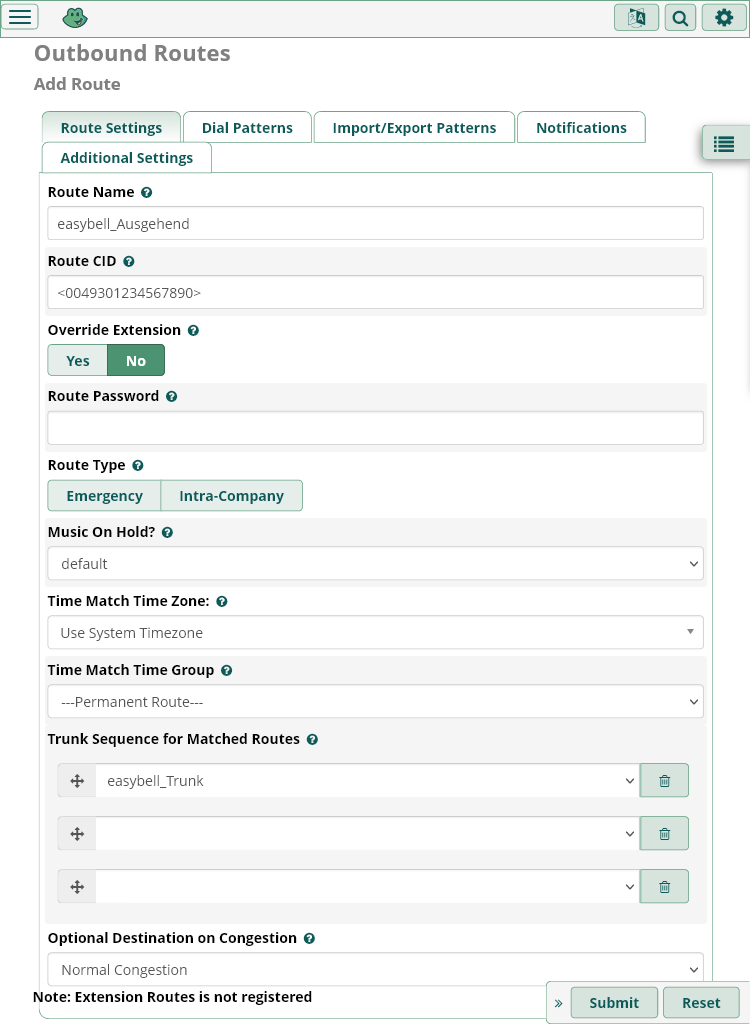 - Route CID: Die Rufnummer, die ausgehend angezeigt werden soll, wenn die verwendete „Extension“ keine Einstellung dazu hinterlegt hat.