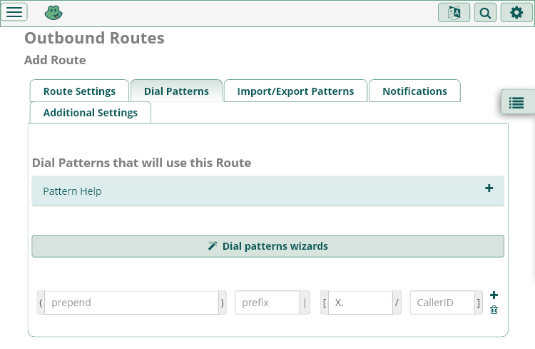 Damit diese Regel greift und ausgehende Verbindungen aufgebaut werden können, muss unter dem Reiter „Dial Patterns“ noch mindestens eine Regel hinterlegt werden, in der man im Feld „match pattern“ einen Punkt einträgt und auf „+“ klickt.