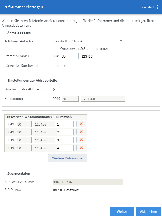 - Rufnummer für die Anmeldung: Geben Sie hier bitte Ihre Durchwahlen ein, die Sie verwenden wollen
