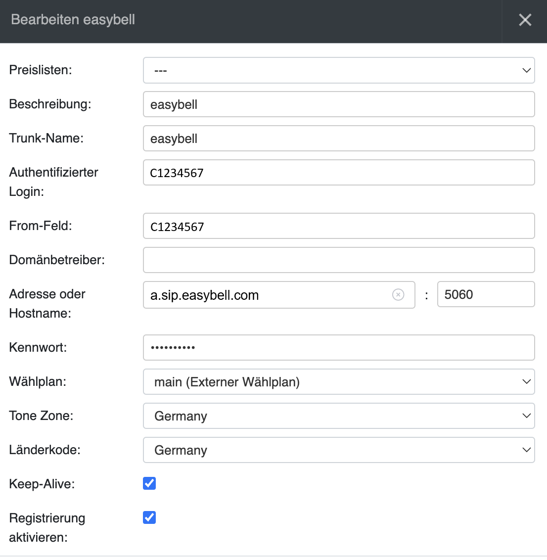 - Kennwort: Das SIP-Passwort des Trunks (siehe Easybell-Kundenportal)