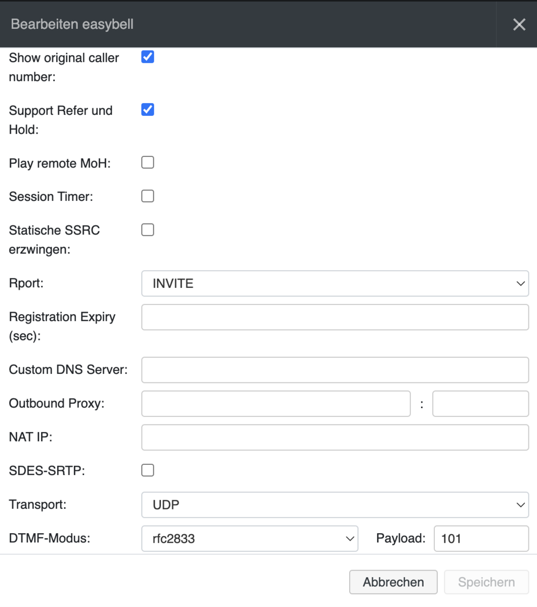 - Authentifizierter Login: SIP-Benutzername des Trunks (siehe Easybell-Kundenportal).